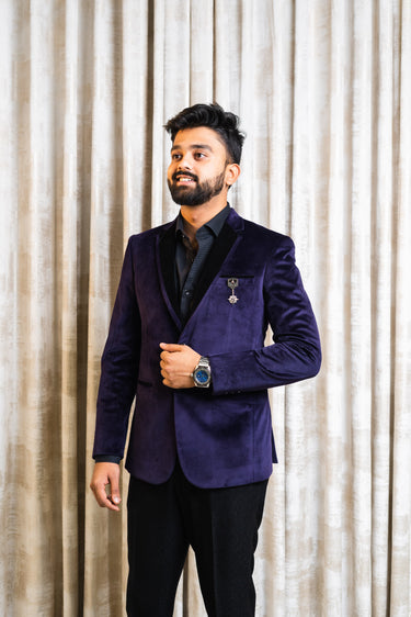 Two button Velvet Blazer with black Velvet on the Lapel made from Velvet Fabric