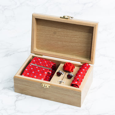 Red tie with white and Blue Jaquard polka sqaures box set