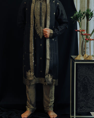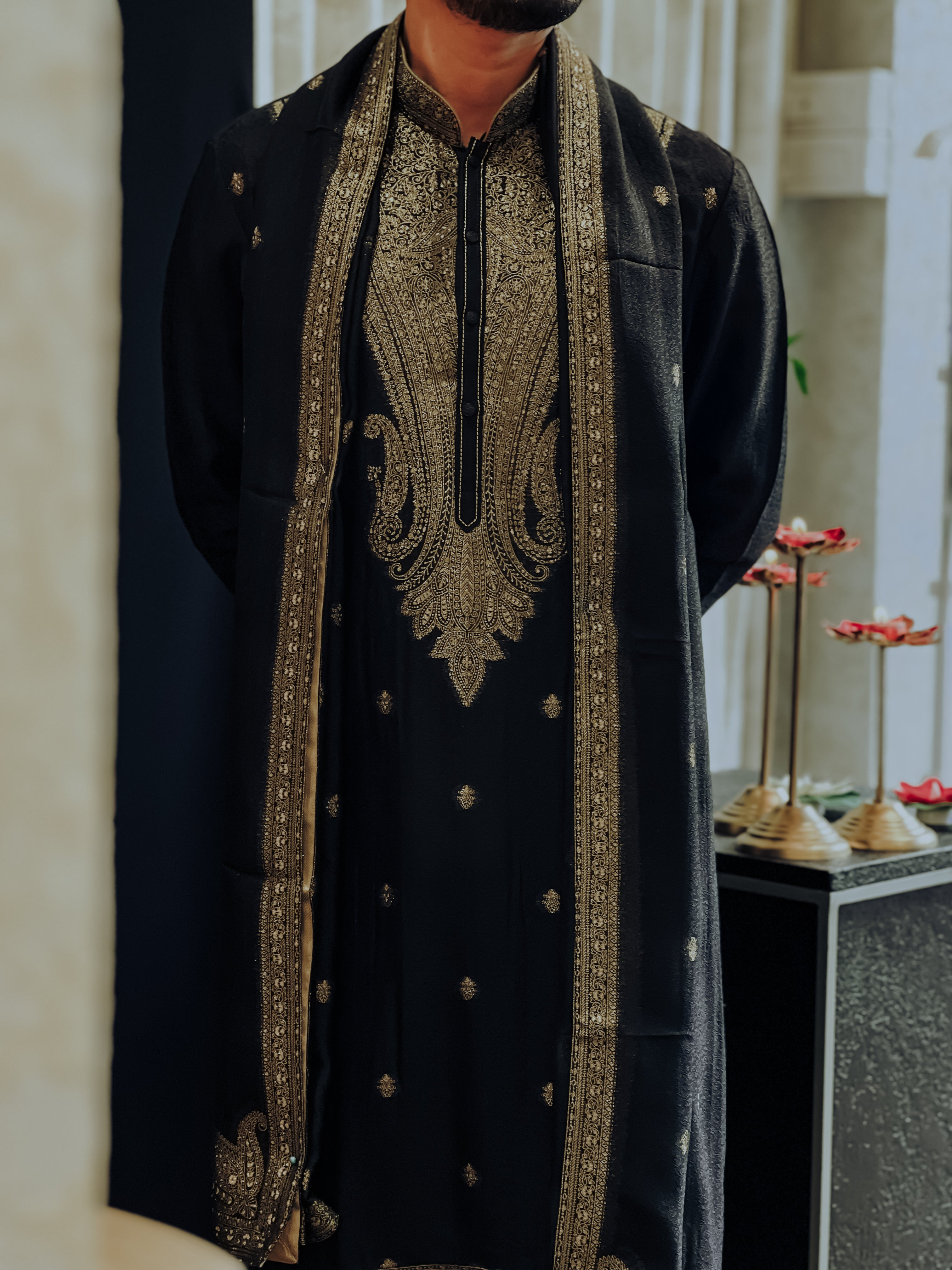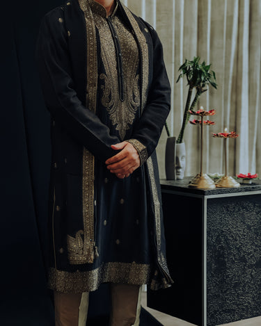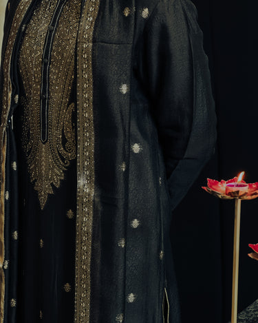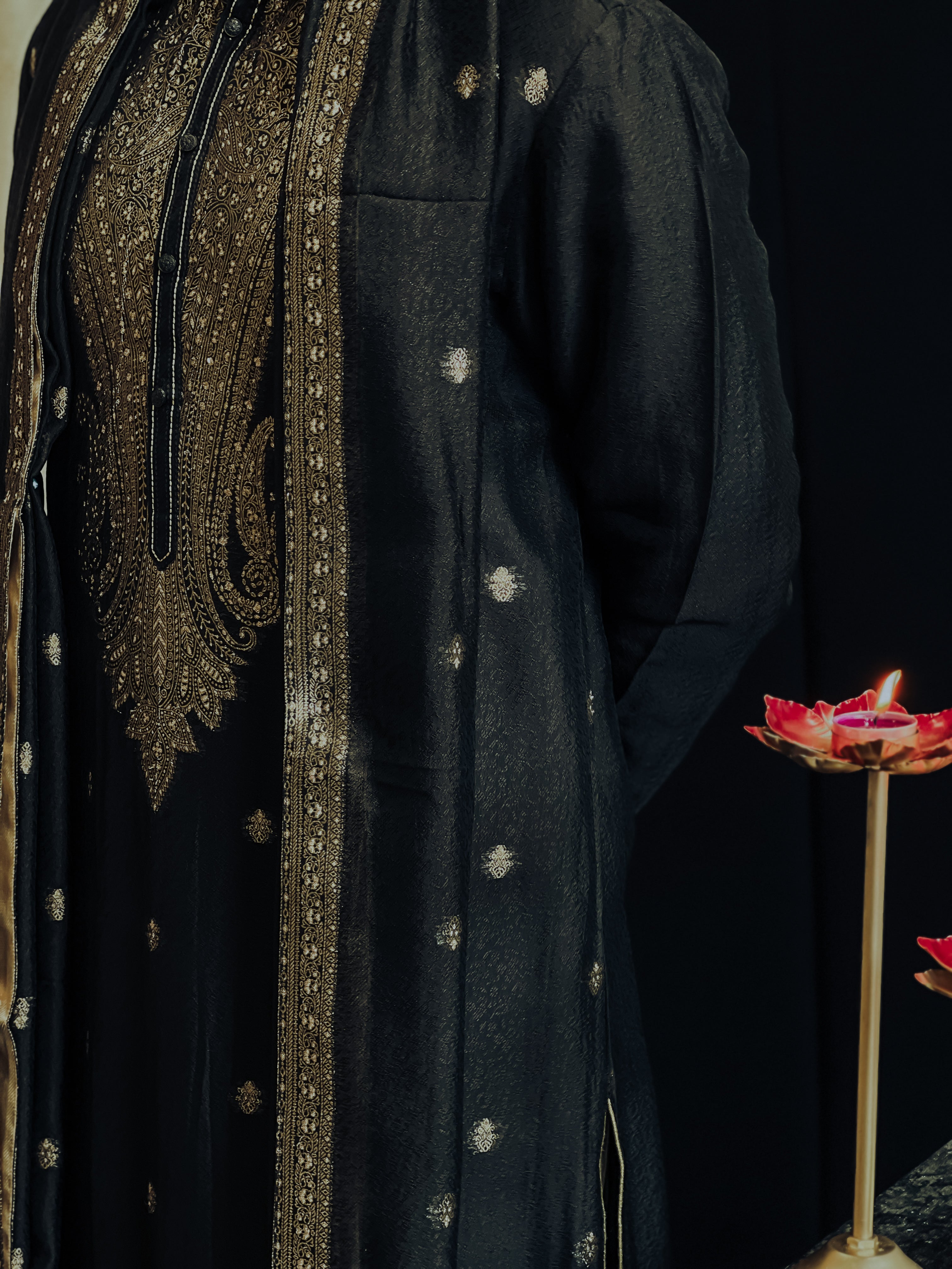 Rich gold paisley and butta work brocade detailing on jacquard fabric
