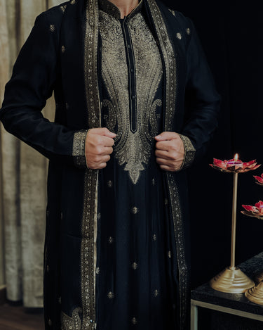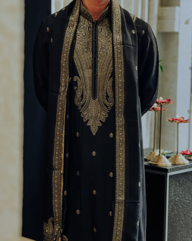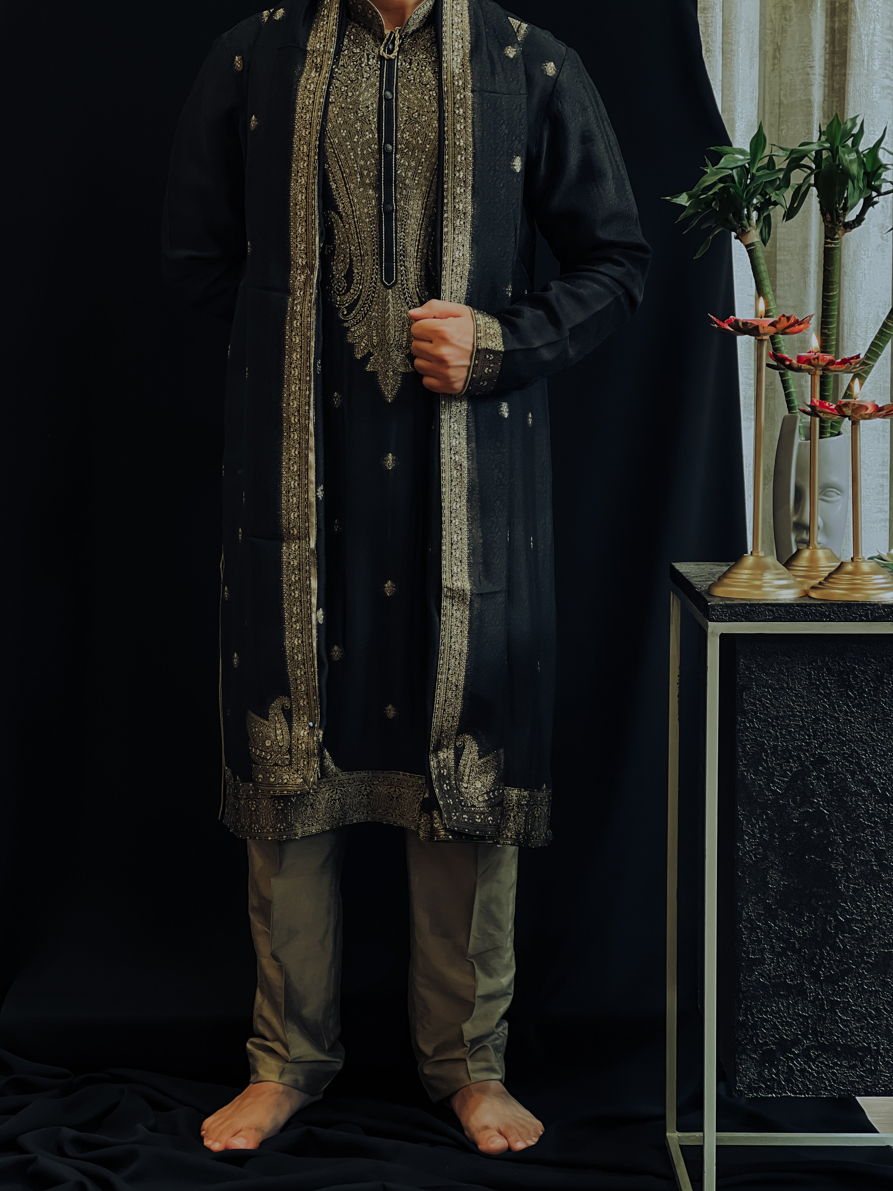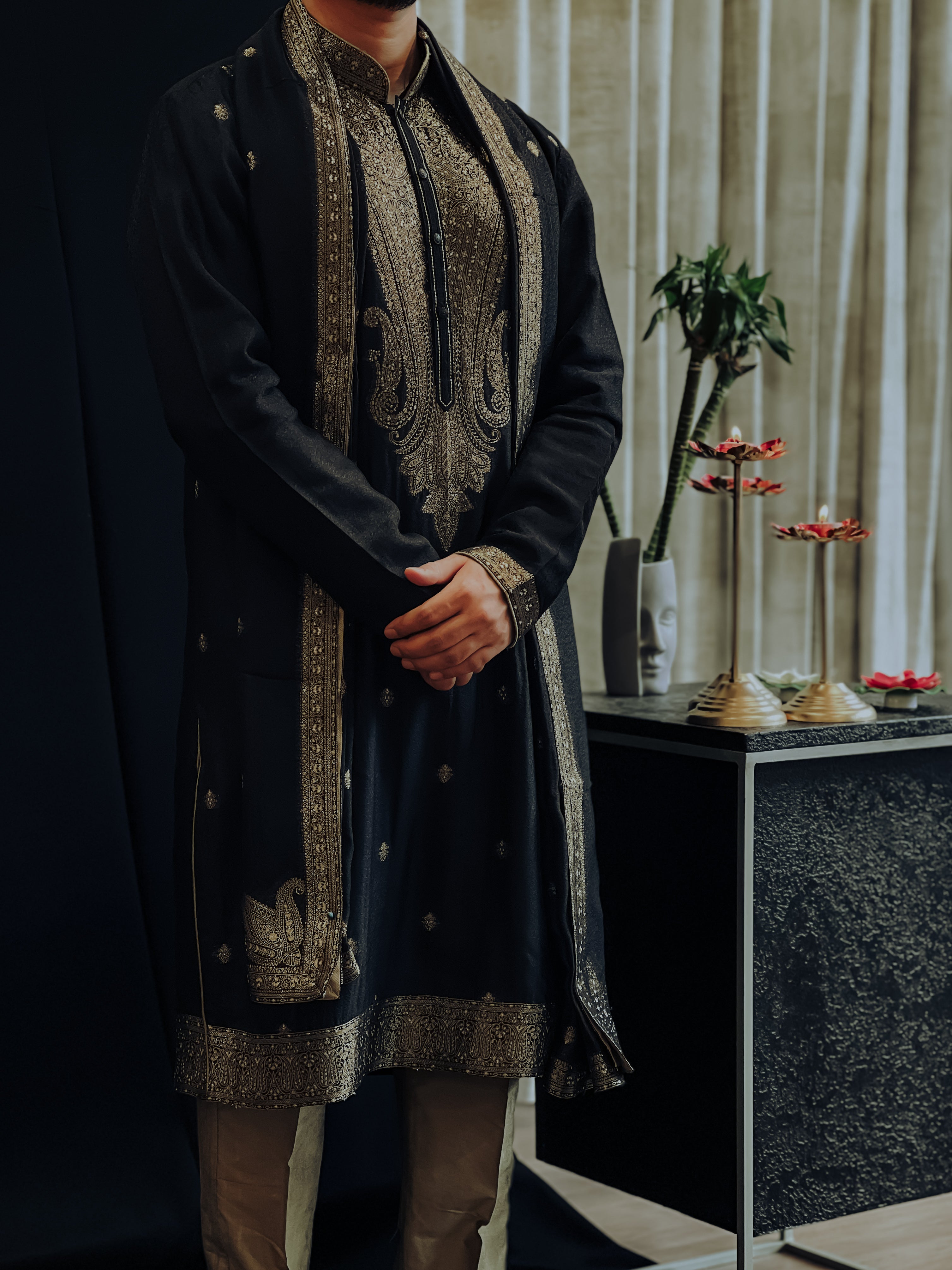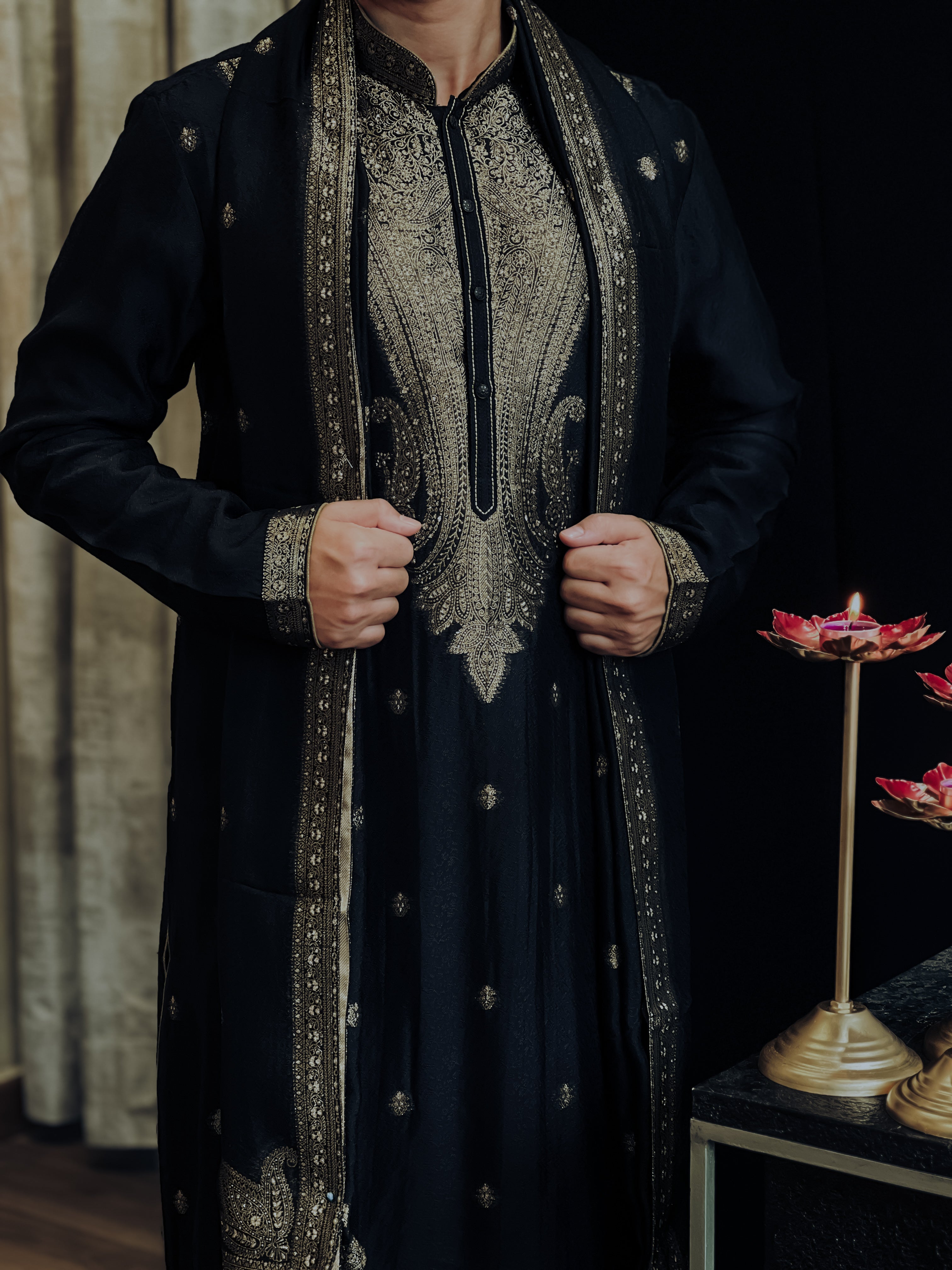 Rich gold paisley and butta work brocade detailing on jacquard fabric