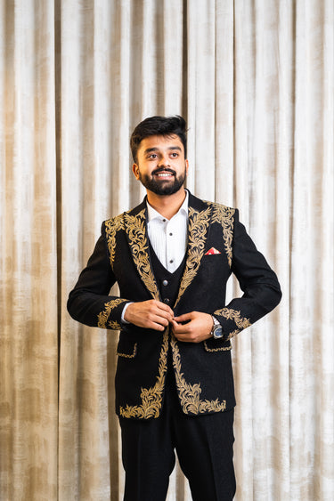 Italian Suit endorned with heavy Gold embroidery on the Lapel and body paired with a double button waist coat made from a shimmer polynosic fabric