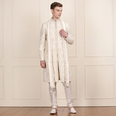 Majestic Cream & Gold Sherwani Set with Dupatta – Timeless Look