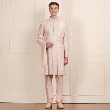 Self color threadwork and minimal stone work on peach base, border detailing on dupatta, chudi bottom pants.